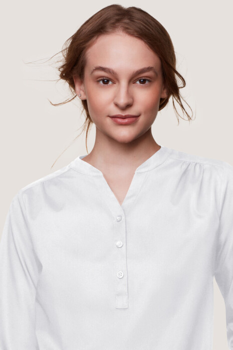 Der V-Ausschnitt bringt moderne Leichtigkeit ins Design, und die Farbpalette – von klassischem Schwarz bis hin zu frischem Ozeanblau – passt sich jeder Corporate Identity oder individuellen Vorliebe an. Pflegeleicht bei 40 °C waschbar und Oeko-Tex-zertifiziert überzeugt die Bluse durch langlebige Qualität und hautfreundliche Verarbeitung. Ob im Büro, bei Veranstaltungen oder als Teil eines professionellen Team-Outfits: HK113 ist die stilvolle Lösung für anspruchsvolle Frauen, die Tragekomfort und einen gepflegten Look schätzen.